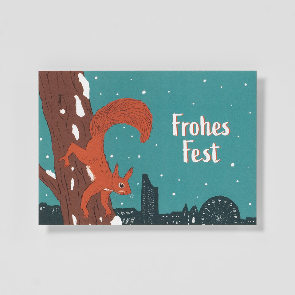 Dieses süße Eichhörnchen im Vordergrund der Leipziger Skyline wurde von der Leipziger Grafikdesignerin Katja Rub im Original auf einen Karton geschabt. Entstanden ist eine besondere Postkarte, die mit ihrer Grafik und Farbigkeit besticht und ein »Frohes Fest« wünscht.